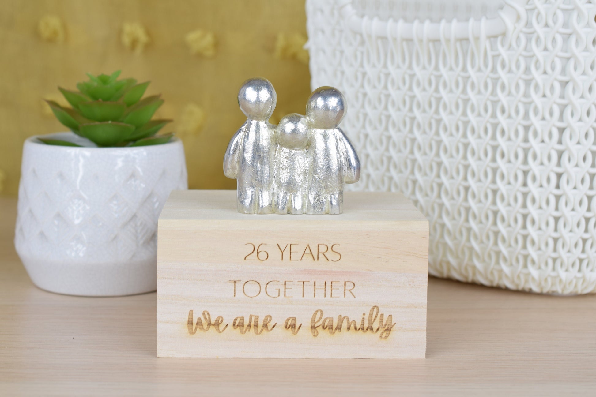 Our hugging family figures come with 2 adults and your choice of a baby or 1 to 3 children stood on an engraved wooden box with 'Together We Are Family'.