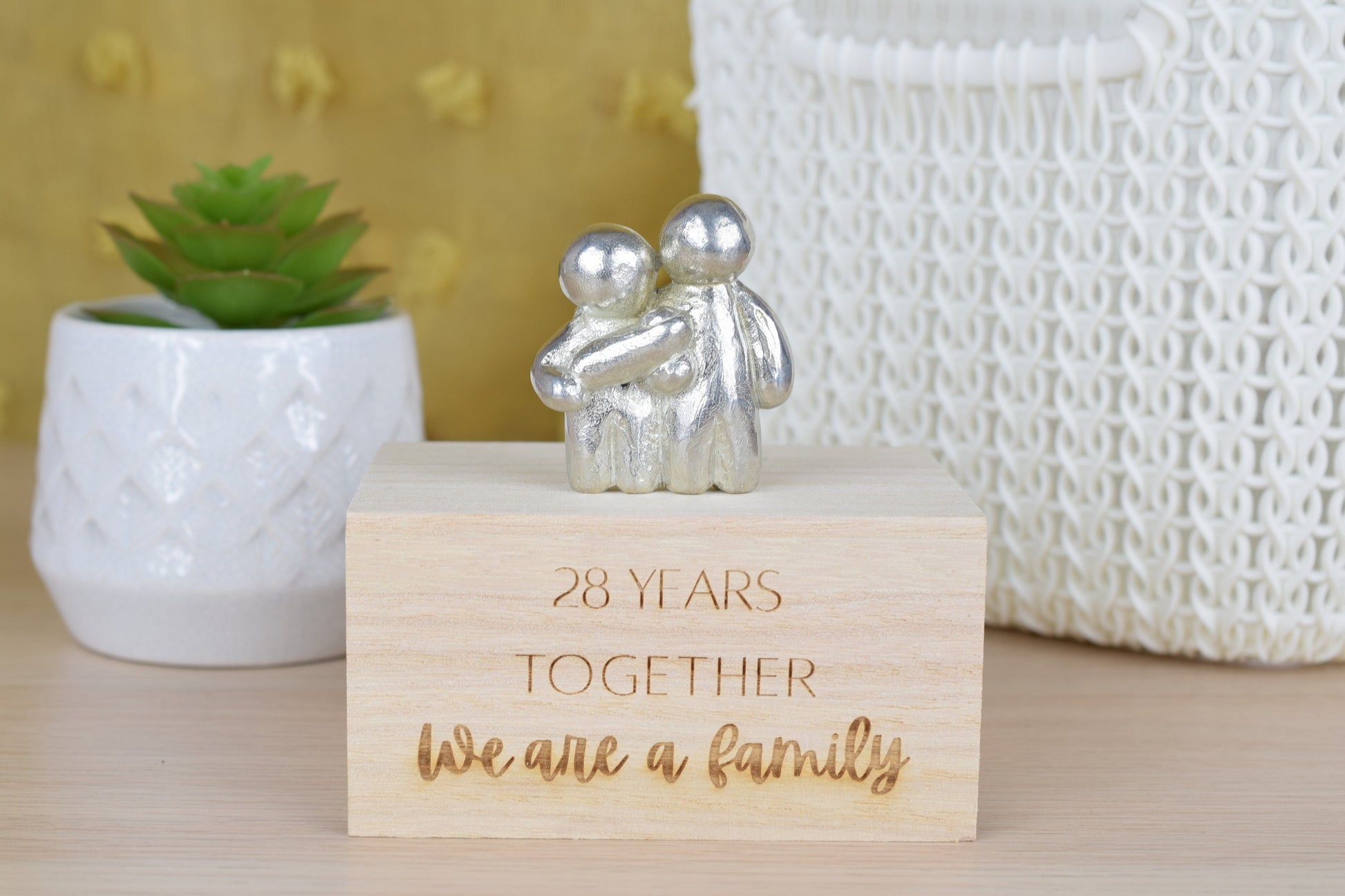 Our hugging family figures come with 2 adults and your choice of a baby or 1 to 3 children stood on an engraved wooden box with 'Together We Are Family'.