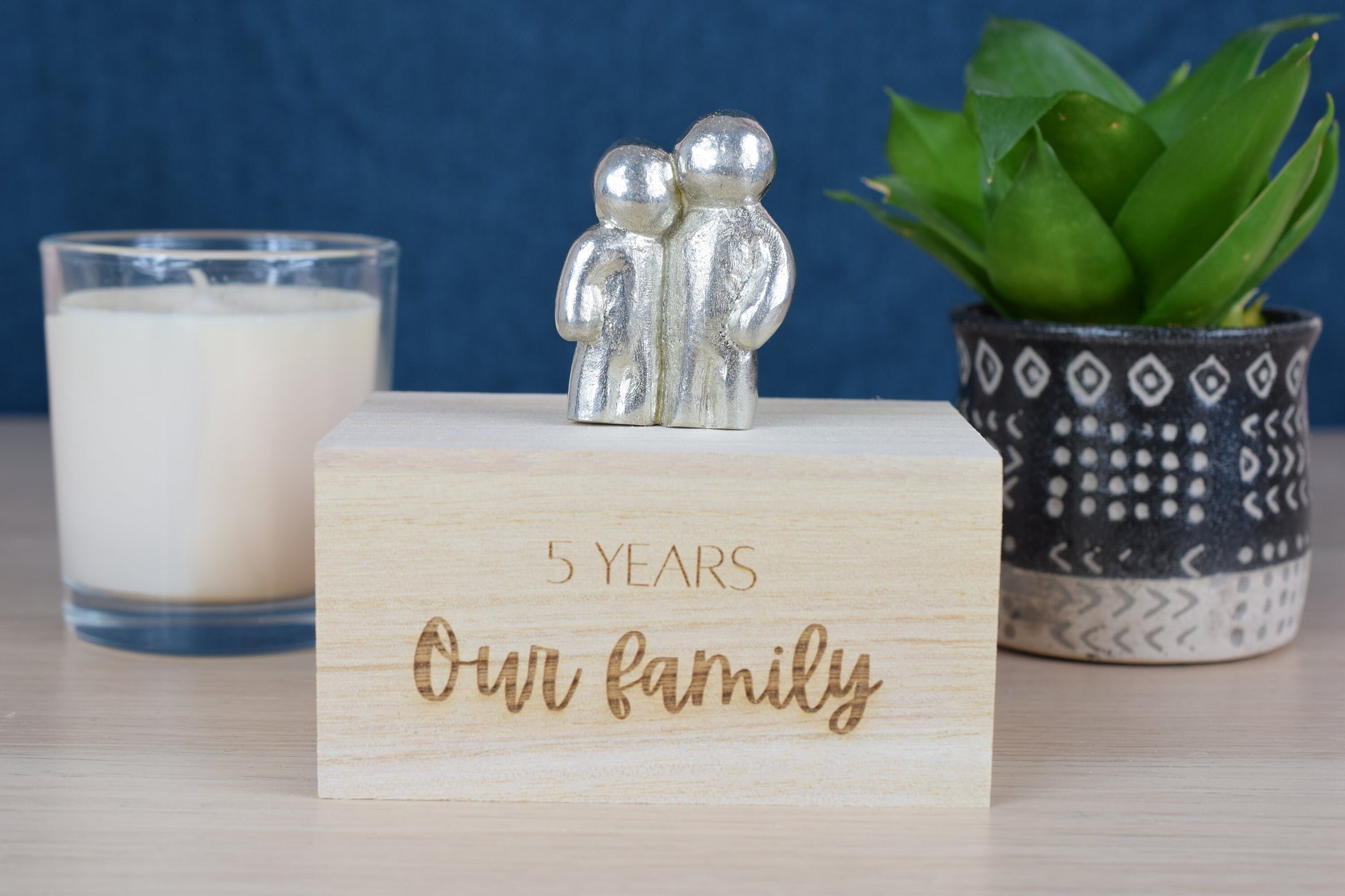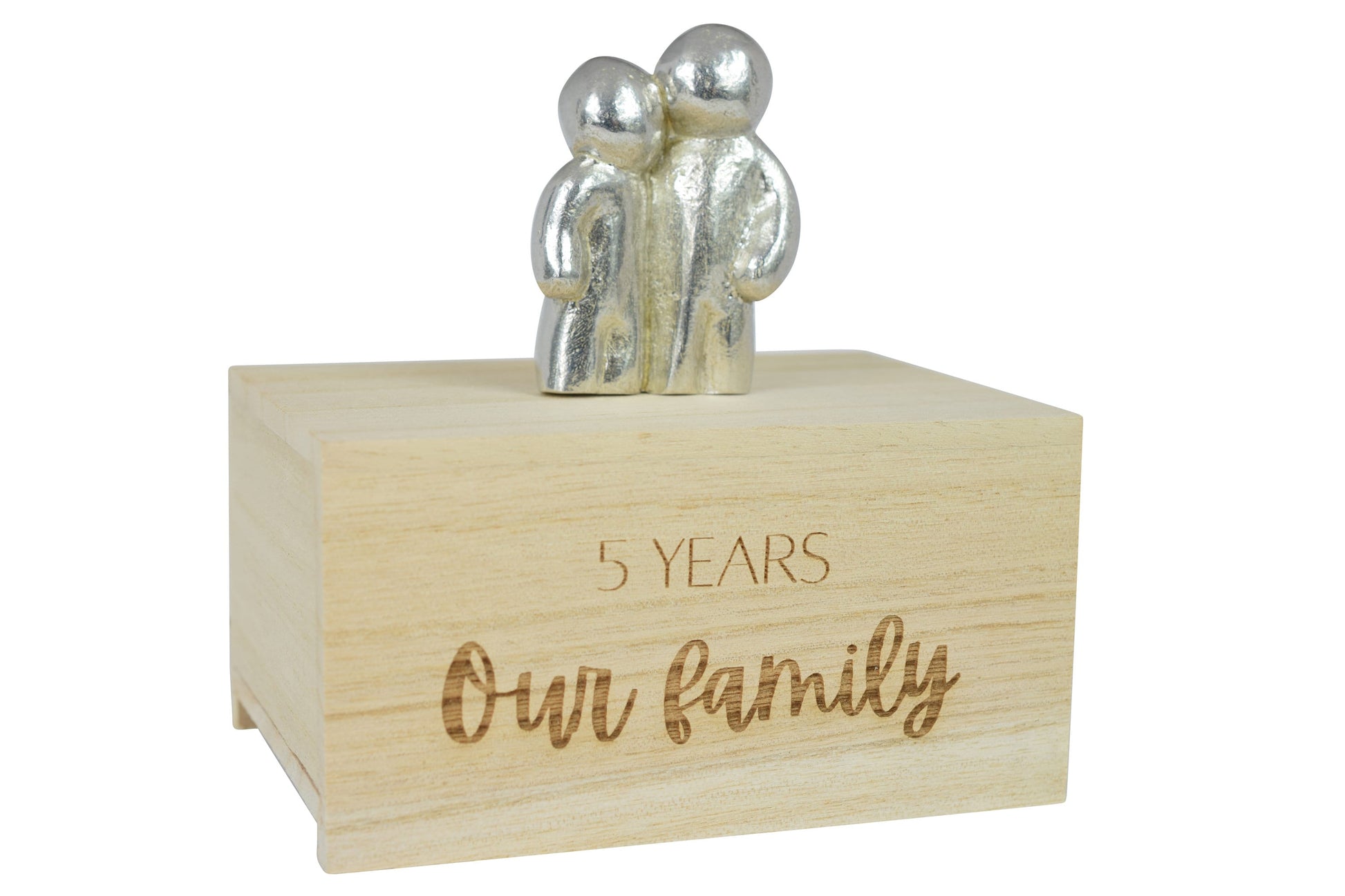Our hugging family figures come with 2 adults and your choice of 0 to 3 children stood on an engraved wooden box with 'Our Family'.